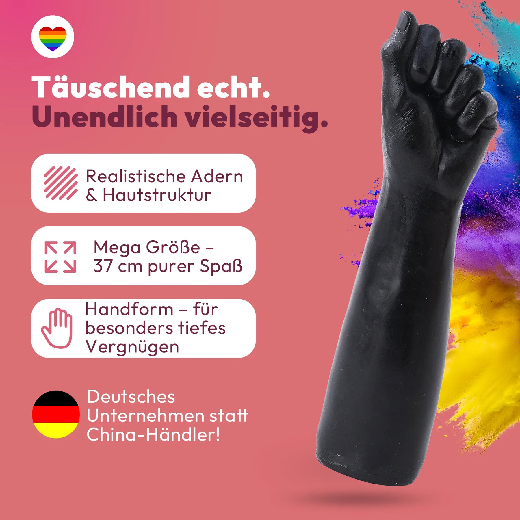 Dieser Dildo in Form einer lebensechten Frauenhand ist schön ergonomisch geformt und hat eine tolle Gesamtlänge von 35cm. Dabei hat die Hand selbst eine Länge von ganze 15cm und dabei einen Max. Durchmesser von 7cm!