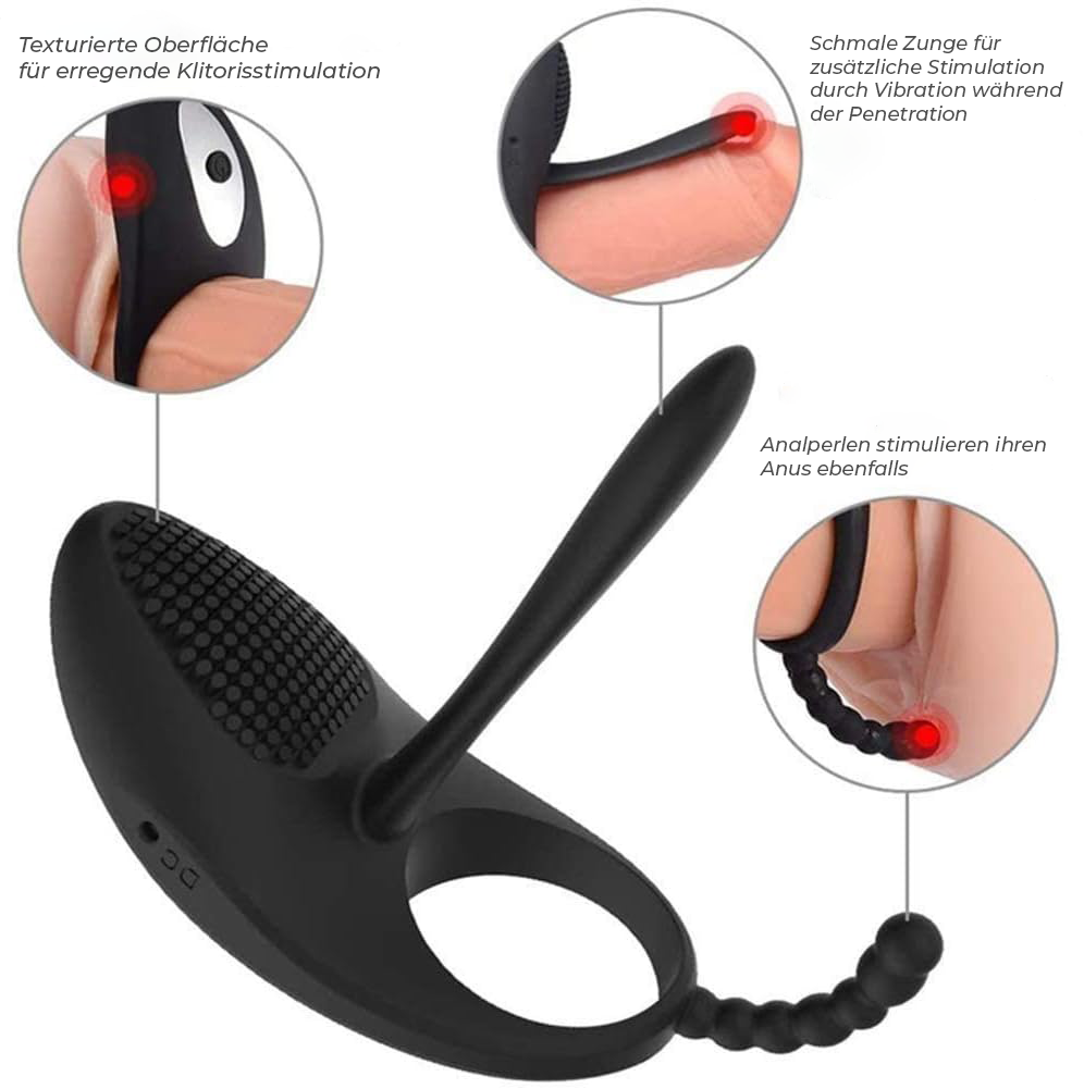 Vibrierender Penisring mit Zungen- und Analvibrator. Paarvibrator mit zusätzlicher Klitorisstimulation.