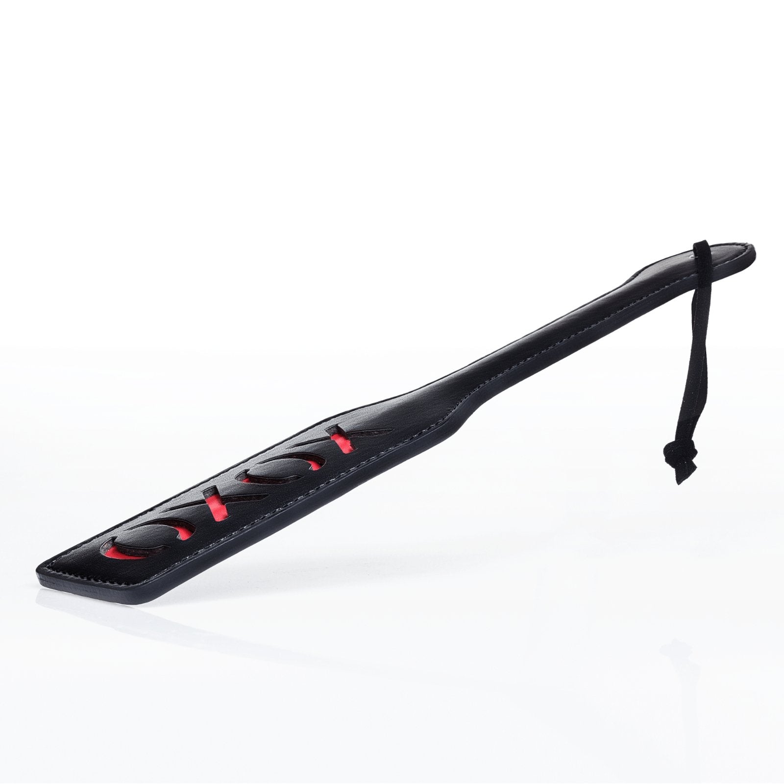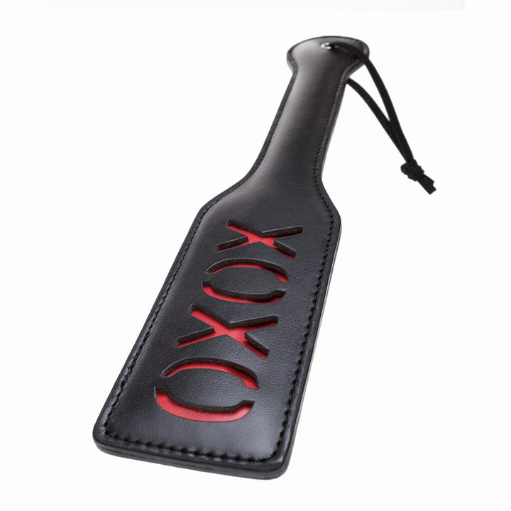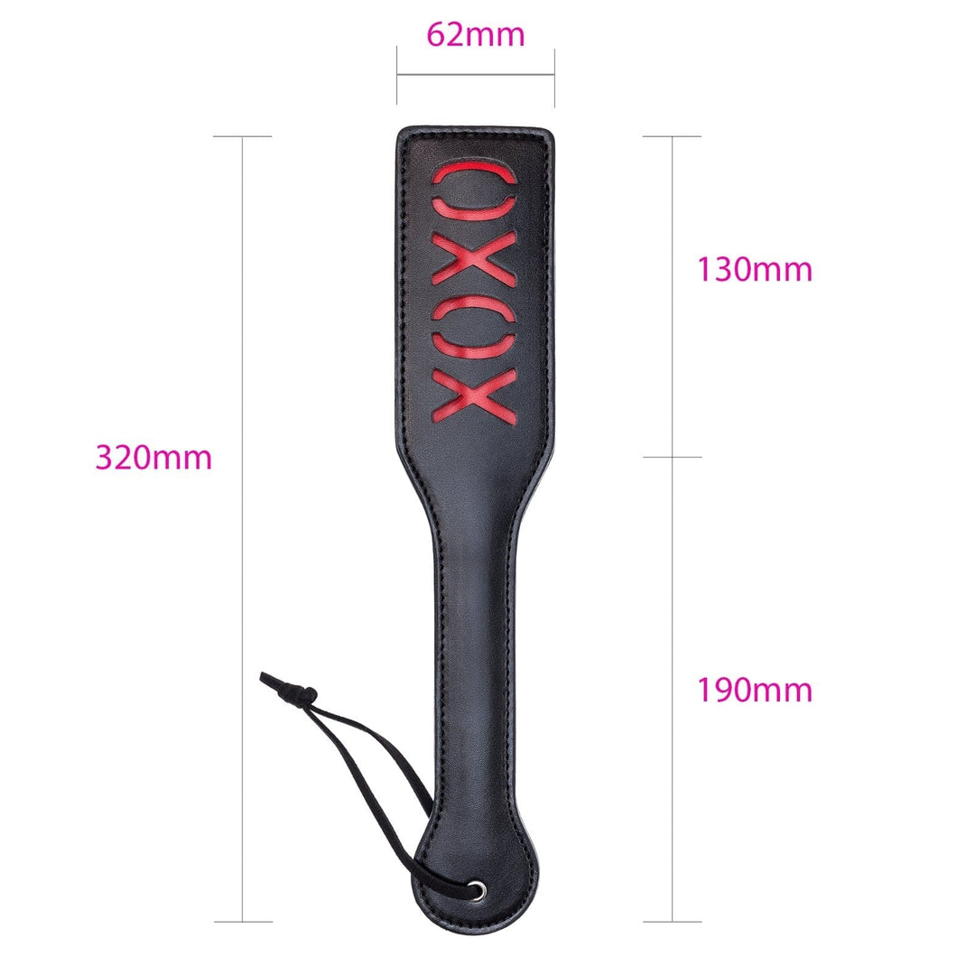 Das XOXO Spankingtool sieht super martialisch aus. Tolle schwarze Lederoptik, 3mm tief ausgeschnittenes XOXO mit rotem Unterleder und der praktische Handgriff machen diese Klatsche zur klaren Ansage für Deinen Partner.
