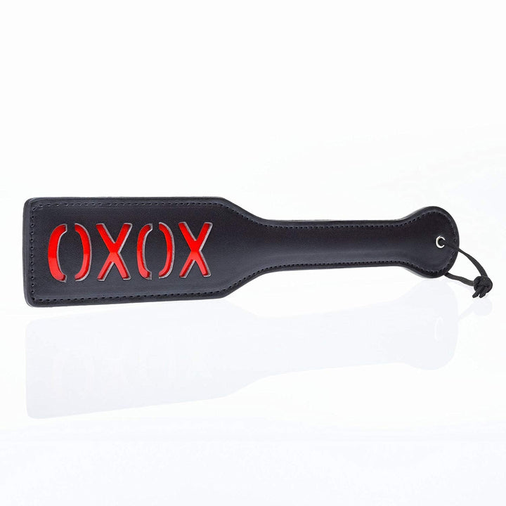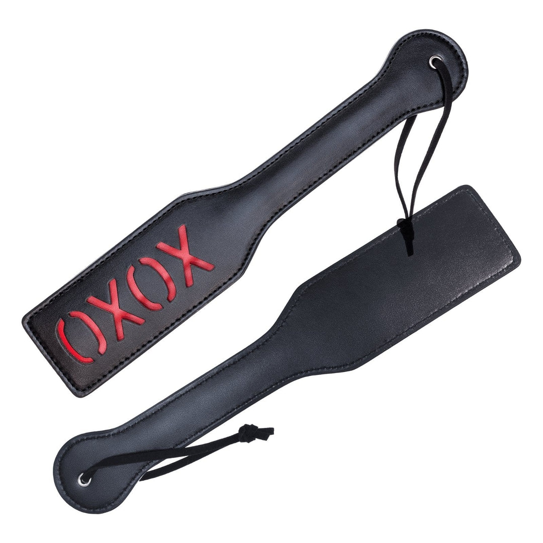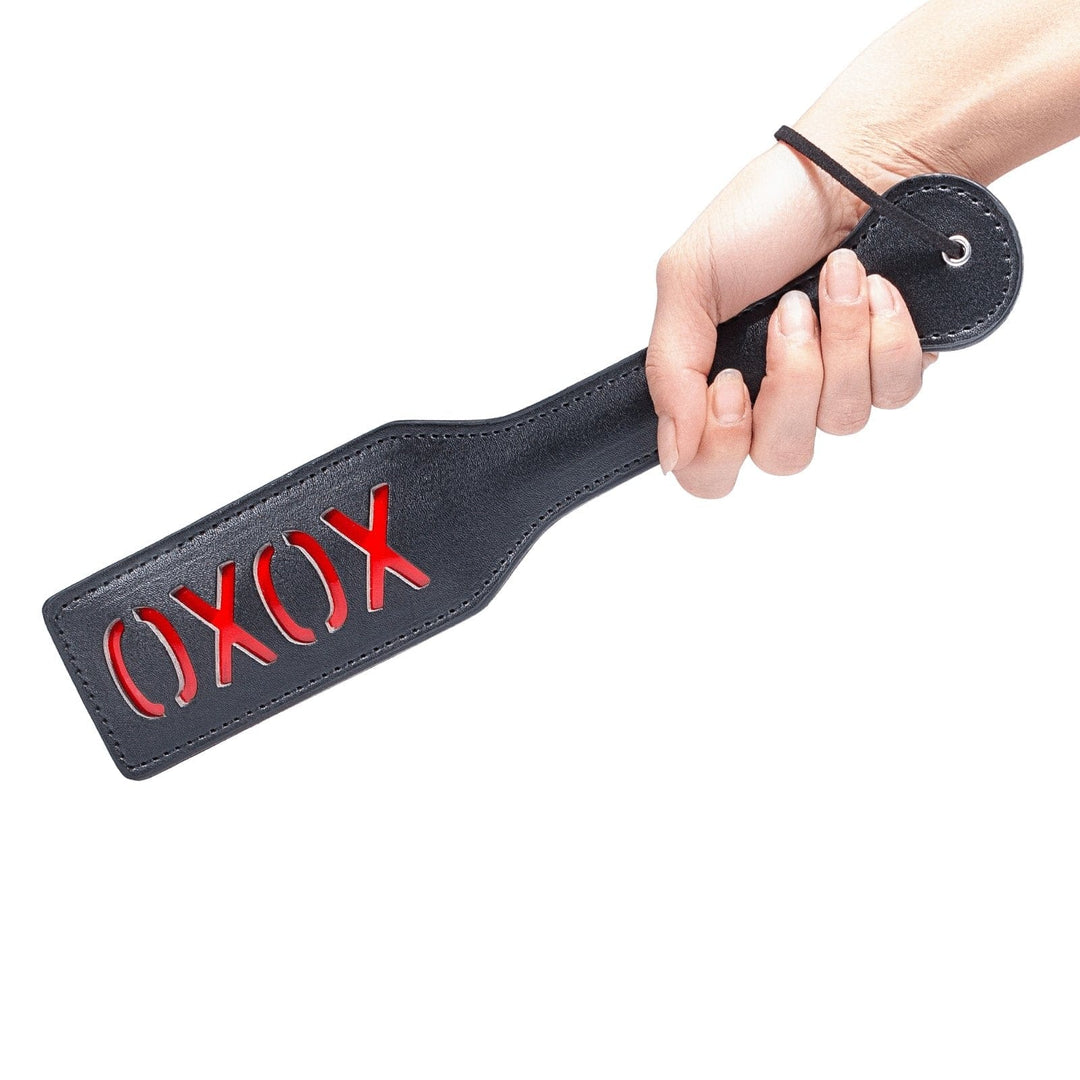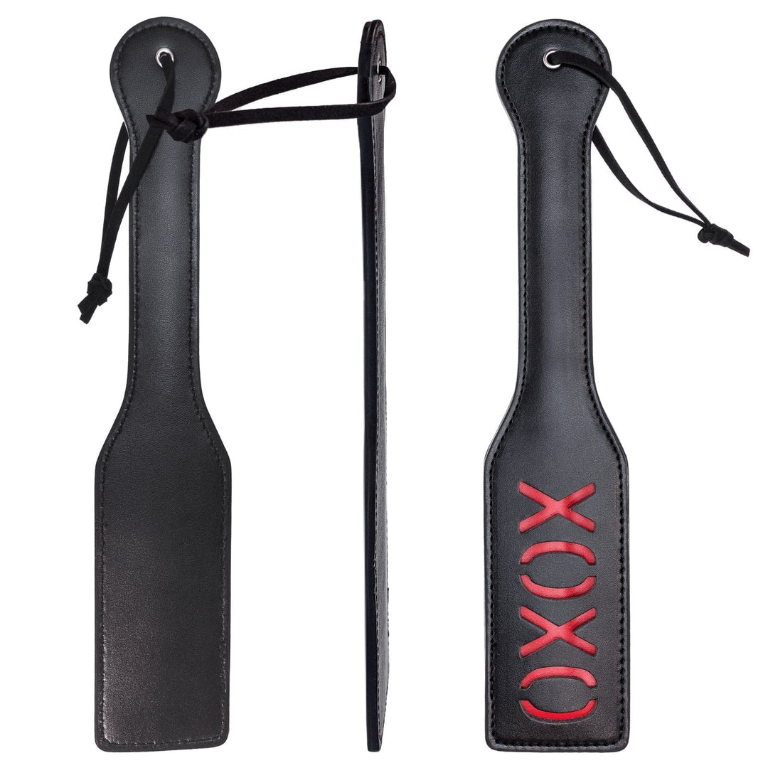 Das XOXO Spankingtool sieht super martialisch aus. Tolle schwarze Lederoptik, 3mm tief ausgeschnittenes XOXO mit rotem Unterleder und der praktische Handgriff machen diese Klatsche zur klaren Ansage für Deinen Partner.